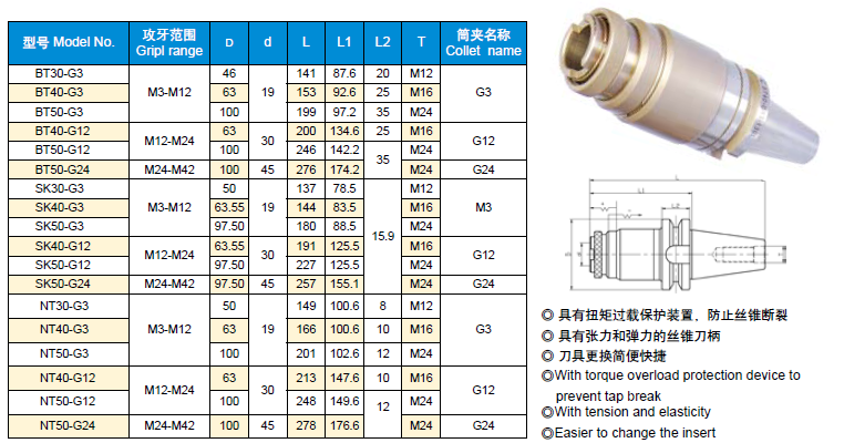 BT、SK(DIN69871A)、NT G型攻絲夾頭刀柄